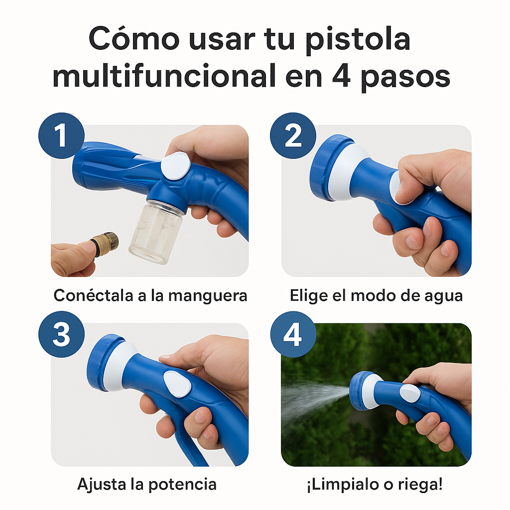 Limpia, riega y enjuaga sin cambiar accesorios, sin esfuerzo y sin desperdiciar agua💦